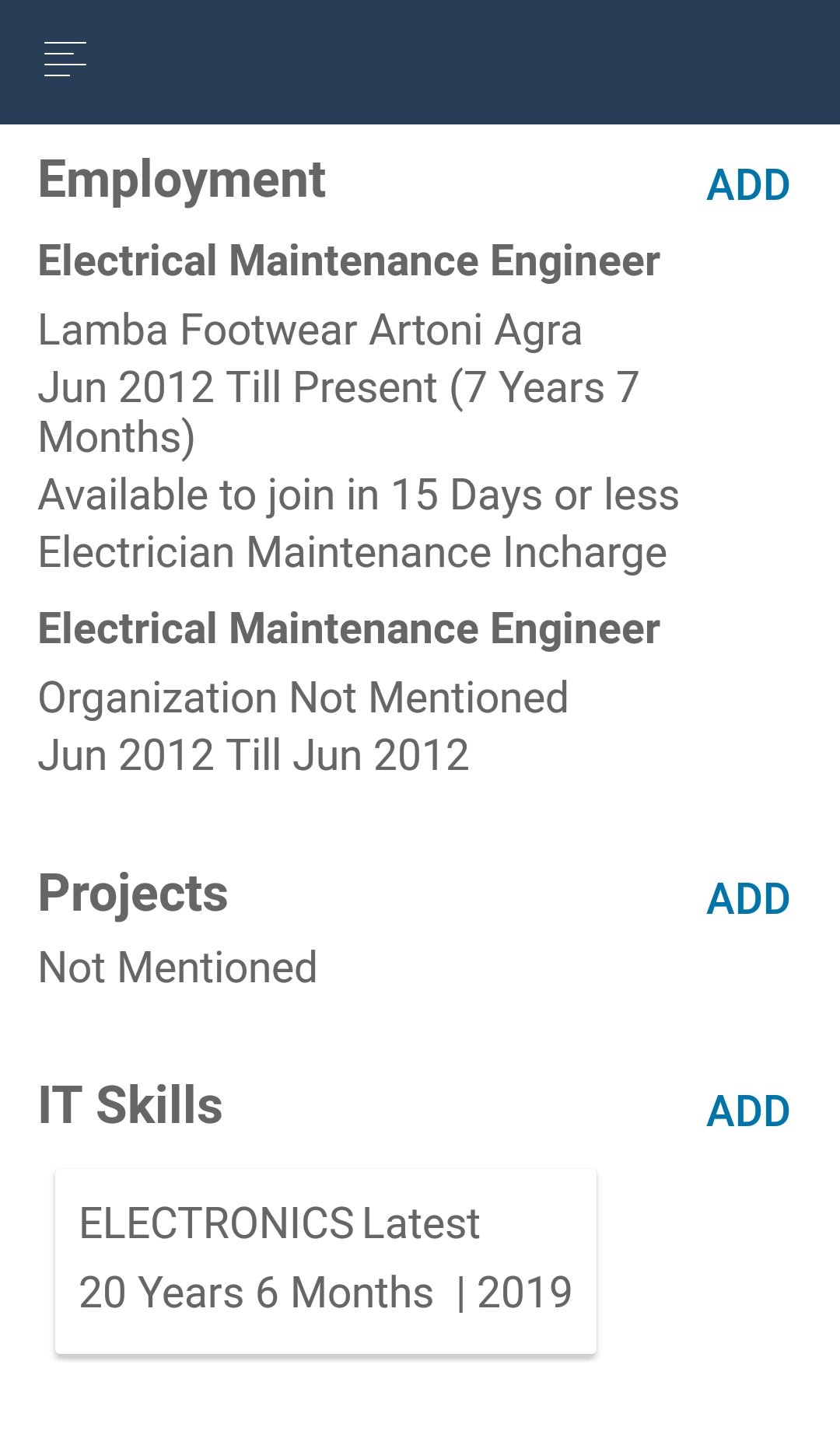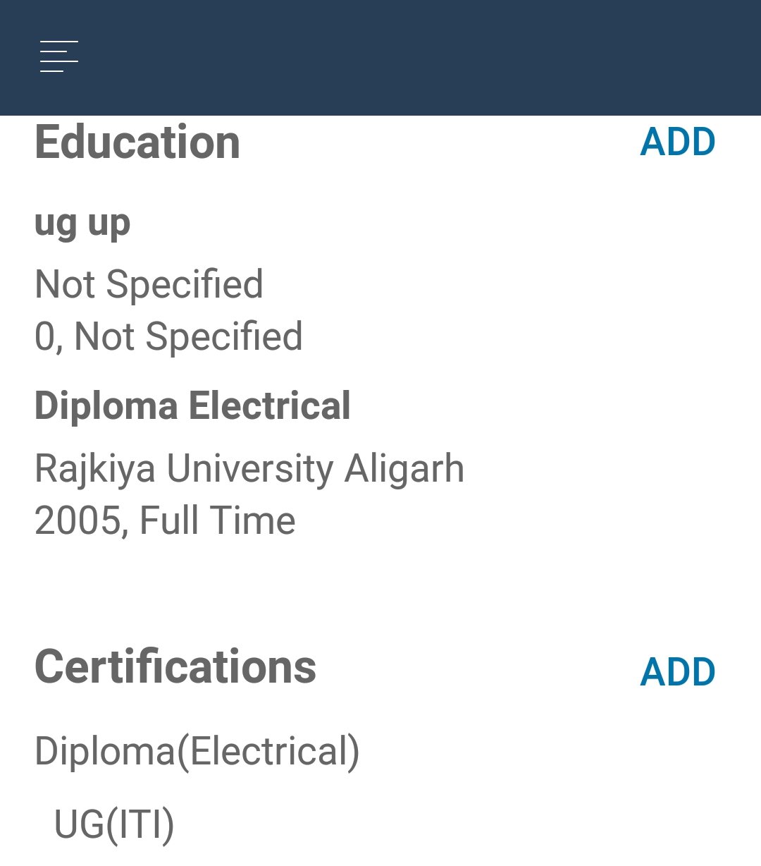• I.T.I. Diploma in Electrician from Rajkiya Audh. Pari. Sansthan Aligarh in the year 2005.